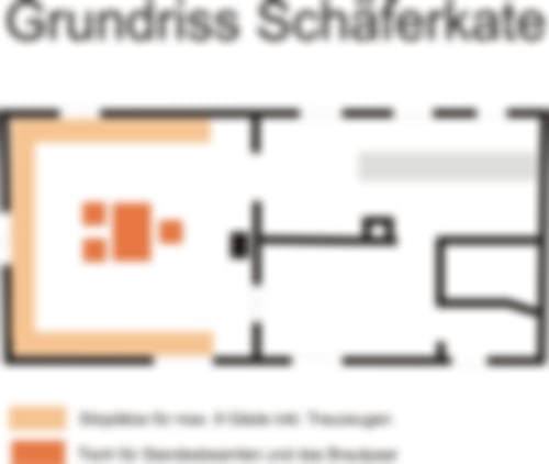 Das Trauzimmer ist die Stube der Kate, eingerichtet mit einem holzbetriebenen Ofen, elektrischem Licht und rundherum fest eingebauten Sitzbänken. Im Winter kann der Raum durch eine elektrische Zusatzheizung vorgeheizt werden.