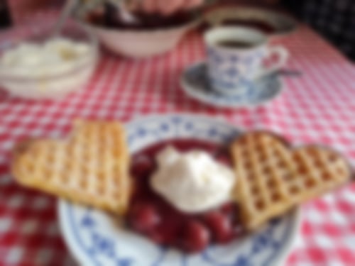 Es gibt leckere Waffeln wie vor 150 Jahren auf offenen Feuer gebacken, dazu heiße Kirschen (rote Grütze), frisch geschlagene Sahne & Kaffee. Das Ganze, solange, bis man nicht mehr kann.